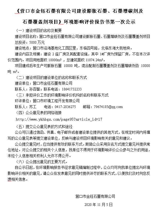 《營口市金鈺石墨有限公司建設(shè)膨脹石墨、石墨增碳劑及 石墨覆蓋劑項(xiàng)目》環(huán)境影響評價(jià)報(bào)告書第一次公示